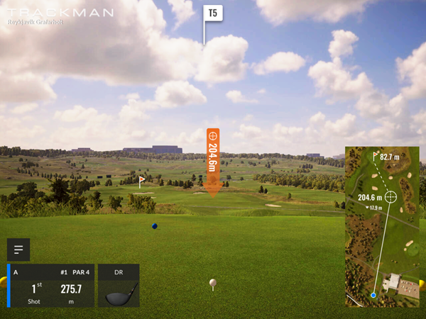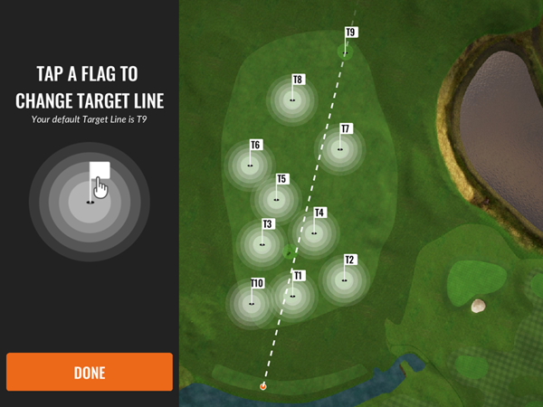 Hér er búið að velja annað mið. Kylfingur slær beint út úr Básnum og velur að skotmörk T1 eða T5 passi best fyrir höggstefnu beint út úr básnum. Mið er staðfest með því að velja DONE. Hægt er að breyta um mið hvenær sem er á meðan á leik stendur.