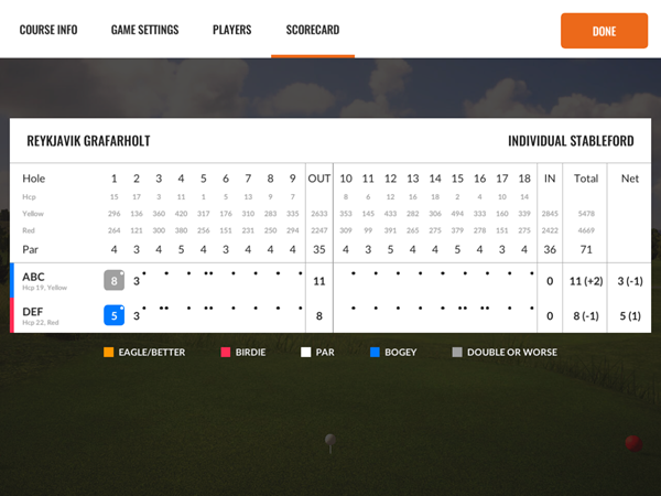 - Með því að smella á „Scorecard“ er alltaf hægt að skoða stöðuna á skorkorti.