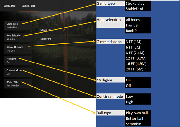 - Ball Type býður upp á val milli þess að hver kylfingur leiki sínum bolta (Play Own Ball), eða liðakeppni, annað hvort Betri bolta (Better Ball) eða Scramble. Ef leikmenn leika betri bolta eða scramble þarf að velja sama lit á þeim leikmönnum sem leika saman í liði.