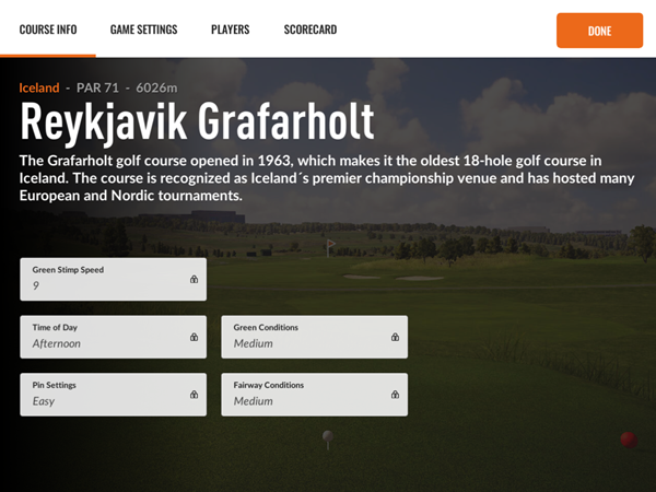 Hér geta kylfingar séð upplýsingar um þann völl sem leikið er á, ekki er hægt að stilla þessa þætti: